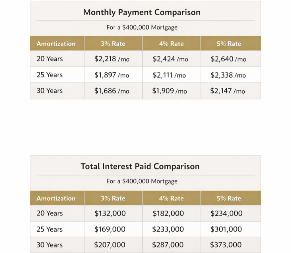 Your mortgage isn’t just about what you can afford monthly—it’s about the total cost over time. Even small changes in interest rates or amortization can mean tens (or hundreds) of thousands of dollars in difference, which is why understanding your options upfront is so important.
